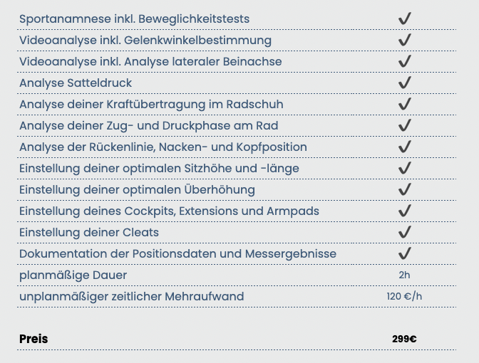 Mehr Komfort, effizientere Kraftübertragung und schmerzfreies Fahren – wir passen dein Rad exakt an deinen Körper an. Basierend auf deiner Beweglichkeit und deiner Anatomie optimieren wir deine Sitzposition gezielt. Mit wissenschaftlichem Ansatz und modernster Mess- und Analysetechnik von Gebiomized schaffen wir die Grundlage für mehr Leistung, bessere Aerodynamik und langfristige Beschwerdefreiheit.